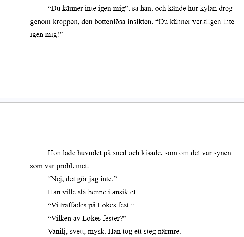 Det är juli 2024, jag plockar fram det lösa utkastet till roman jag har skapat, det har fått vila flera månader. Ens första kärlek är en sjukdom, kanske blir man aldrig frisk, jag ser det nu, något jag inte sett förut. En idé om vad jag vill förmedla, en övertygelse om vilka teman den här berättelsen ska utforska. Jag kan betrakta romanen som man ser på den där sortens synvillor där en bild innehåller två bilder samtidigt. Blicken har öppnats, jag kan se den både som min egen text och en främmande, med utifrånblicken, samtidigt.