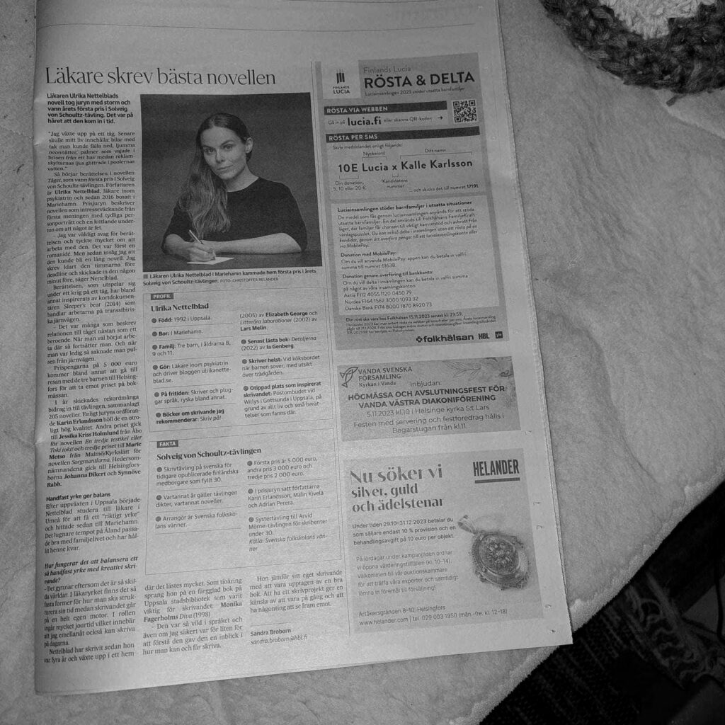 Det är oktober 2023, dagen efter att jag varit på prisutdelningen. Jag sitter på ett lekland i ett shoppingcenter i utkanten av Helsingfors. Mina barn leker själva, så stora nu, jag dricker kaffe.