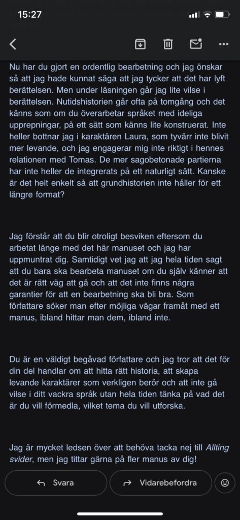 Jag får standardrefuseringar och undrar om jag skrivit något som är sämre än manuset som aldrig blev. Jag får personliga refuseringar som är väldigt mycket it’s not you it’s me, förklaringar om varför min bok är bra men att den som läst inte älskar den tillräckligt för att ta sig an den.