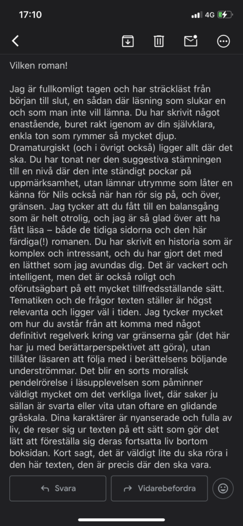 Alla oväntade möten och kontakter som mitt skrivande lätt till, att orden verkar i världen och att det finns människor som brinner för mina texter. Att det på riktigt finns folk som sprider, tipsar, hejar på mina texter. Att jag fick ett meddelande där det stod jag var på en fest och träffade en som jobbar med böcker och vi hade ett långt samtal om dig och ditt skrivande, hen tipsade om att du borde kontakta… Det är märkligt och mäktigt och gör mig rörd.