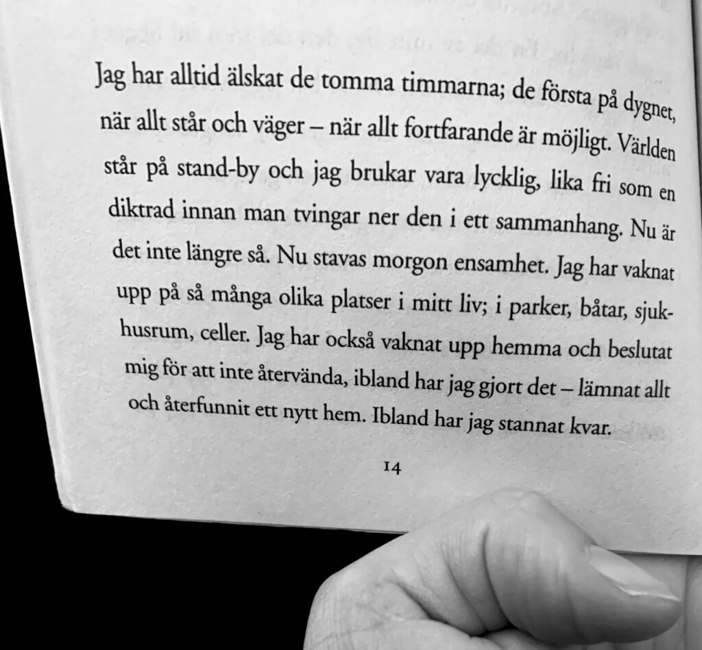 Vi väntar in ett nytt år i stillhet. Kanske börjar mina barn växa ur dessa stillsamma snälla nyårsfiranden som varit vår kokong under flera år, snart vill min stora fira med vänner istället, vara hemma på Åland. Det blir ett annat slags rörelse, ett annat slag stillhet. Vi sitter i mitt barndomshus i doften av äkta gran och av hyacinter. Vi äter småkakor och saffransbulle. Vissa läser, andra gamear, jag och en tolvåring spelar Finans. Han kallar till bolagsstämma och brädar mig genom att tvångsköpa mina företagsgrupper. Skrattgroparna, hans tindrande ögon.