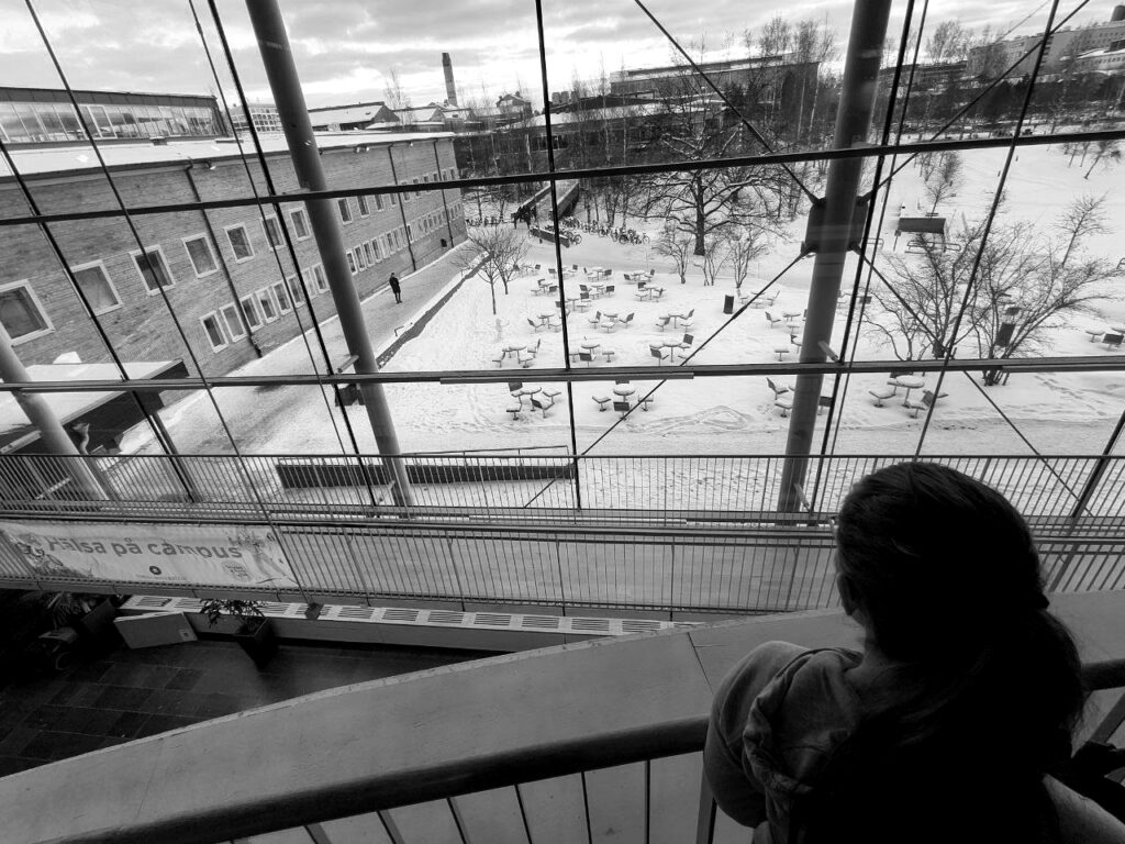 En dag på Medicinska biblioteket i Umeå, när jag är på researchresa för boken. Det är jag och min vän, vi smyger runt på sjukhuset och tar fotografier, vinklar och vrår jag vill kontrollera och minnas för att de ska stämma med scener i boken, små detaljer men viktiga för att inte ruska någon ur magin, jag är rädd att någon ska tro att vi är spioner, denna besynnerliga dokumentation av till synes obetydliga detaljer.